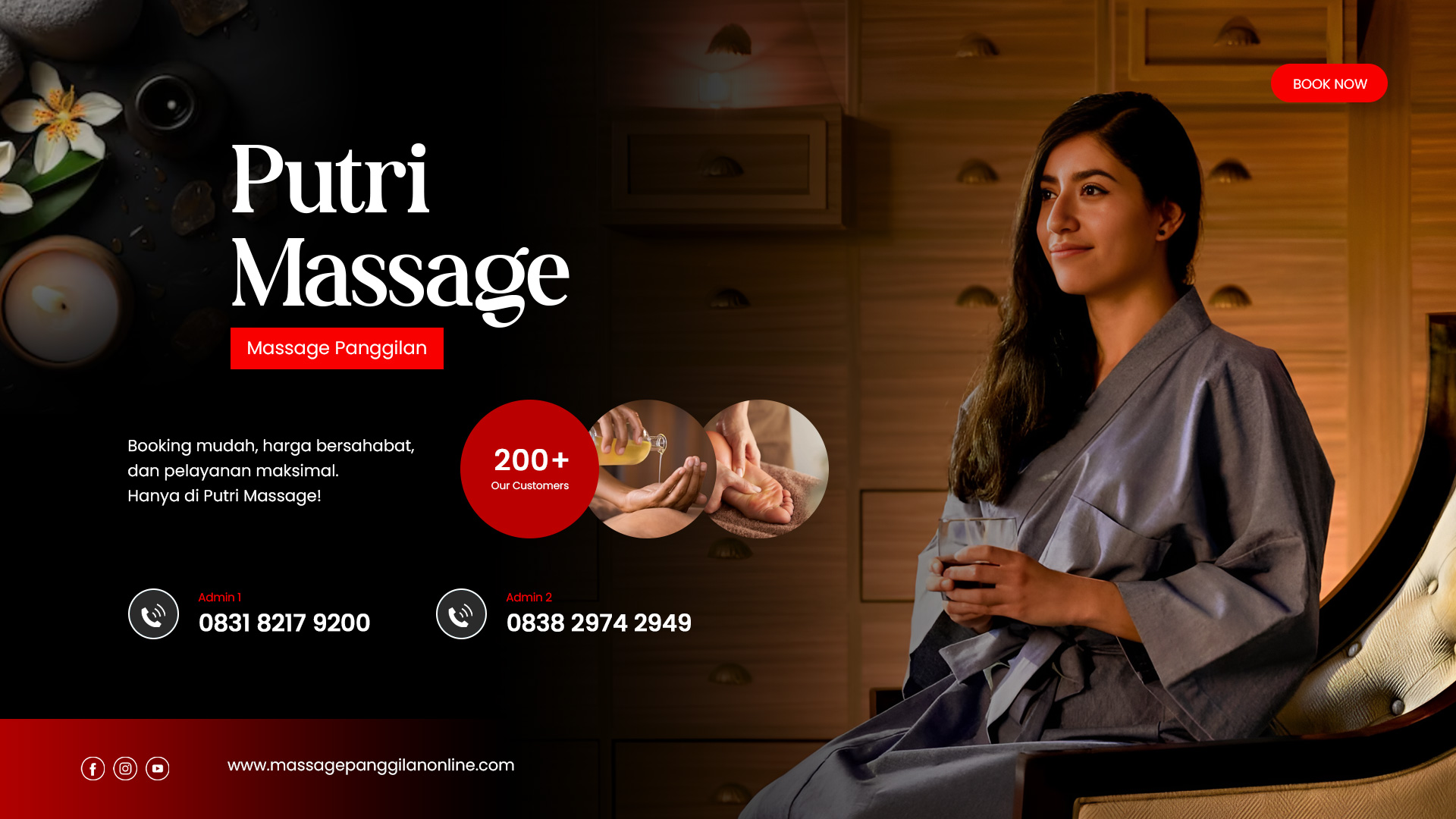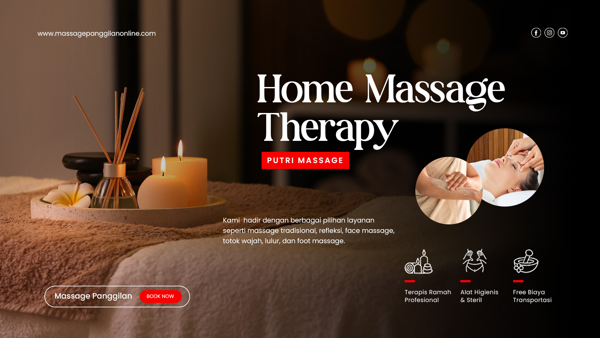 Capek setelah seharian bekerja? Badan pegal karena aktivitas yang padat? Kini Anda tidak perlu repot datang ke tempat massage , cukup hubungi Putri Massage, dan terapis kami akan langsung datang ke tempat Anda – baik di rumah, hotel, atau kantor. Praktis, nyaman, dan menenangkan!